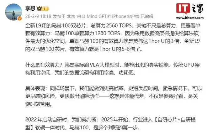 参考IT之家此前报道,李想在今年 2 月 9 日发文介绍了全新理想 L9 搭载的马赫 100 双芯片(总算力 2560 TOPS)。他表示,关键不只是总算力,更要看单颗有效算力。