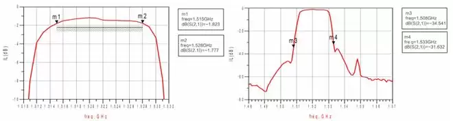 此款产品应用在北斗接收端口。经测试,在 CW 信号下,最大耐受功率≥40dBm (10W);优化近端抑制≤-48dB@1618MHz;带内插损在 1.8dB 以内,提升信号灵敏度。