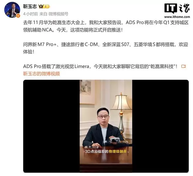 IT之家 3 月 30 日消息,华为智能汽车解决方案 BU CEO 靳玉志今天在微博发布视频,宣布 ADS Pro 城区领航辅助 NCA 功能今天将开启推送,鸿蒙智行问界新 M7 Pro+、奇瑞捷途旅行者 C-DM、长安全新深蓝 S07、五菱华境 S 等车型都将搭载。