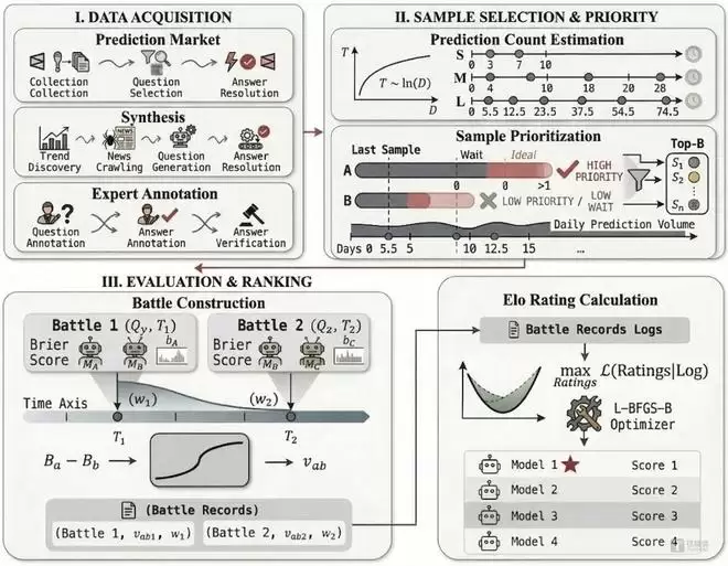 第三阶段为对战构建,采用 point-aligned Elo 机制,严格只比较"同一道题、同一预测时间点"的结果,以解决时序不对称问题。