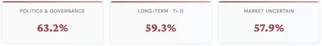 在与 Polymarket 人类交易市场的直接对比中,UniPat AI 公布了一组分层数据:在政治与治理领域,EchoZ-1.0 胜率为 63.2%;在预测期限超过 7 天的长期预测中,胜率为 59.3%;在人类信心区间为 55%-70% 的市场不确定场景中,胜率为 57.9%。