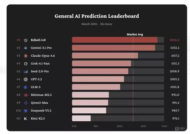 该系统由动态评测引擎、Train-on-Future训练范式和预测专用模型EchoZ-1.0三部分组成。在General AI Prediction Leaderboard 2026年3月榜单中,EchoZ-1.0以Elo 1034.2位列第一,并在与 Polymarket 人类交易市场的直接对比中展现出显著优势。