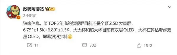 【CNMO科技消息】3月30日,数码博主“数码闲聊站”发文称,某TOP5年底的旗舰屏目前还是全系2 5D大直屏,约6 75英寸1 5K+约6 89英寸1 5K,大大杯和超大杯目前有双层OLED屏幕,