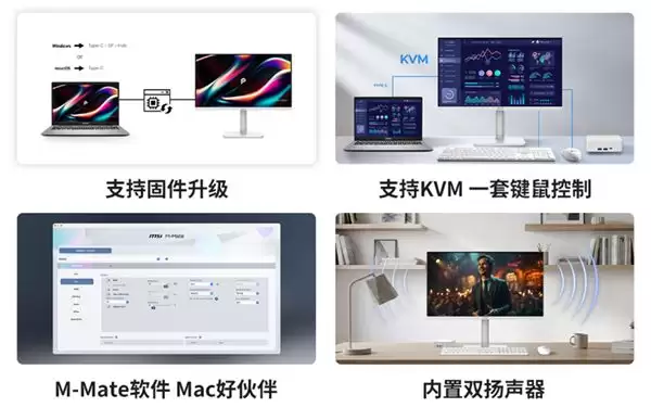内置KVM功能,允许用户通过一套键鼠在两台接入设备间无缝切换,显示器还内置双扬声器,并支持M-Mate软件以优化Mac设备兼容性。