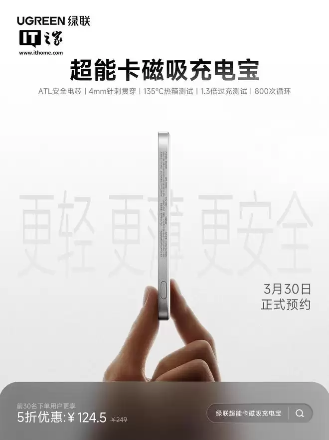 IT之家 3 月 30 日消息,据 UGREEN 绿联最新微博,绿联宣布推出一款超能卡磁吸充电宝,该产品采用行业首批 ATL 过针刺电芯,定价为 249 元。参考海报,该充电宝正面磁吸处采用白色配色