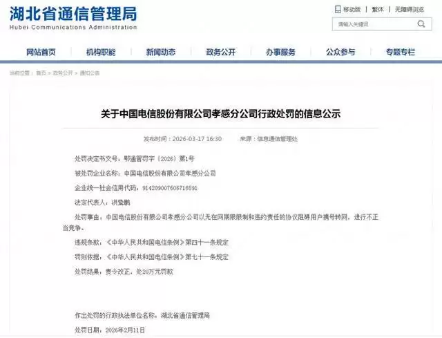 原标题:《中国电信一分公司因阻碍用户携号转网被湖北省通信管理局罚款20万元》