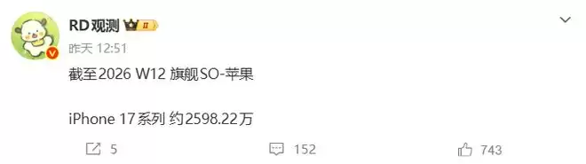 3月30日消息,根据博主“RD观测”发布的消息显示,截至2026年第12周,智能手机市场三大旗舰系列的出货量数据相继披露,头部品牌市场表现呈现显著分化。数据显示,iPhone 17系列以2598 2