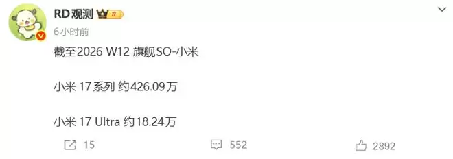 PChome 3月30日消息,据博主“RD观测”最新数据,截至2026年第12周,小米17系列国内累计出货量约426.09万台;同期iPhone 17系列出货达2598.22万台,约为小米的6倍,高端市场呈现苹果断层式领先。