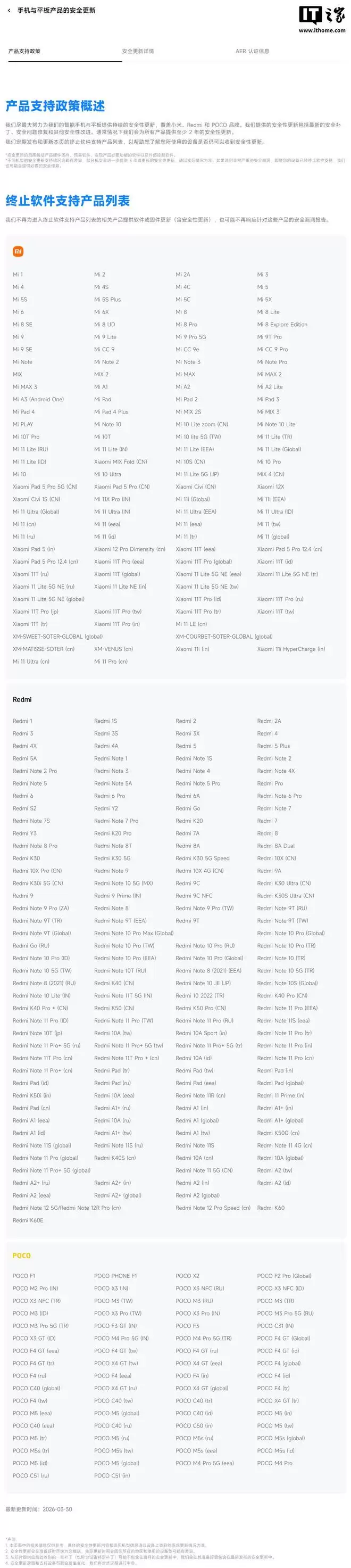 IT之家 3 月 30 日消息,小米正式安全中心现更新智能硬件产品终止软件支持产品列表。IT之家注意到,智能手机与平板板块显示,Redmi K60 和 Redmi K60E 将停止软件或固件更新(含