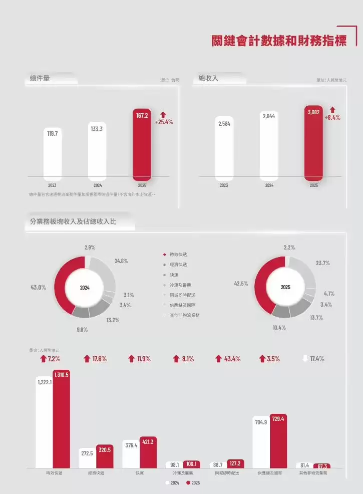 从报告获悉,2025 年,顺丰控股深化“激活经营”机制,充分激发全员创业精神,推动业务规模化增长。全年业务量突破 167 亿票,同比增长 25.4%,增速高于快递行业整体水平。