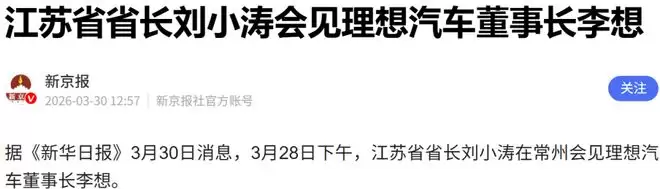 电 动 知 家 消 息,3月30日,据多家媒体报道, 3月28日下午,江苏省省长刘小涛在常州会见理想汽车董事长李想。刘小涛感谢理想汽车长期以来对江苏发展的支持和贡献。
