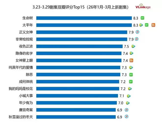 下图为上周剧集豆瓣评分Top15,有两部作品口碑出炉进入榜单,分别是7.9分的《正义女神》和7.4分的《隐身的名字》。难得的是,《隐身的名字》热度同样表现亮眼,是近期为数不多兼具口碑和热度的作品。其他上榜作品豆瓣评分不变。