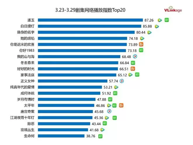 下图为上周网播指数Top20,热度最高的剧集分别为古偶剧《逐玉》和《白日提灯》。前者高开高走,持续保持居高不下的热度;后者首秀优异,后续热度上升空间较大,有望成为下一部爆款。