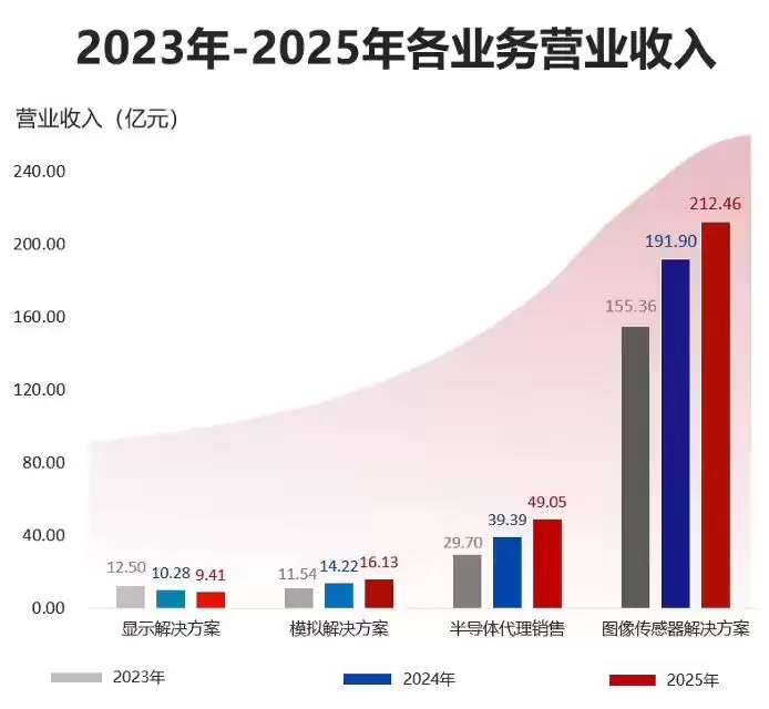 在半导体设计业务中,图像传感器解决方案以212.46亿元的营收占据核心地位,占主营业务收入的73.73%,同比增长10.71%。模拟解决方案业务表现亮眼,营收达16.13亿元,占比5.6%,较上年增长13.43%。相比之下,显示解决方案业务营收为9.41亿元,占比3.27%,出现8.47%的下滑。半导体代理销售业务收入49.05亿元,占主营业务收入的17.02%,同比增长24.52%,成为另一重要增长点。