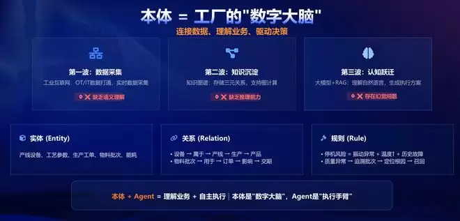 本体作为工厂的“数字大脑”,负责打通各实体数据联动、解析业务关系与运行规则,而智能体则作为基于本体的“执行手臂”,承担自主决策、流程编排与系统执行的核心职责。