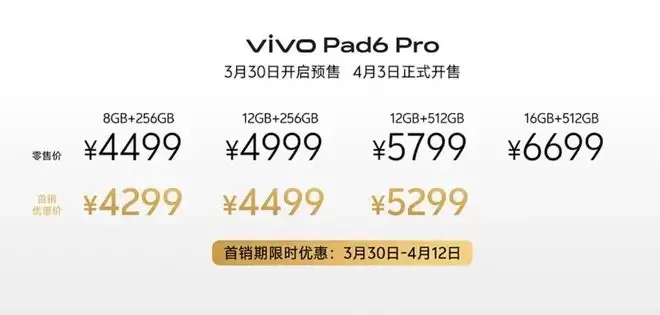 在此基础上,vivo Pad6 Pro起售价4499元,4月3日正式开售。