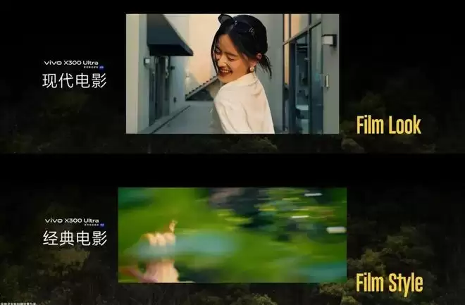 vivo X300 UItra还带来了电影感视频,经典电影Film Style,2.4:1宽银幕画幅,24fps黄金帧率,还有运动模糊、胶片光晕和颗粒感,直出电影感;现代电影Film Look,16:9比例,丝滑60fps,电影感色调、顺滑的视觉体验。