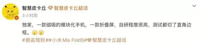 另外,博主@智慧皮卡丘 的一份爆料中提到过“一款磁吸的模块化手机,一款折叠屏,自研程度很高,测试都切了直角边框”。