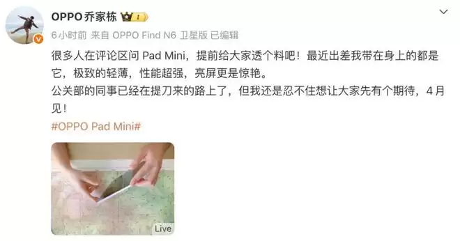 近日OPPO官宣了K15 Pro 系列新机将于4月1日发布,同时也曝光了不少后续的新品信息。今天,OPPO智能生态产品总监乔家栋公布了OPPO Pad Mini的真机外观,并发文称:很多人在评论区问