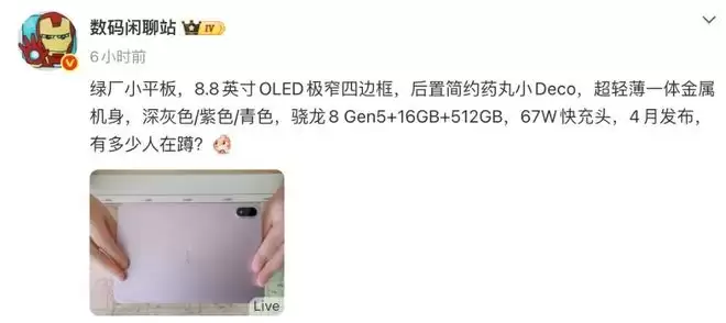 爆料中提到,这款小平板将配备8.8英寸OLED屏幕,极窄四边框,后置简约药丸小Deco,超轻薄一体金属机身,带来深灰色、紫色、青色几款可选配色。核心搭载骁龙8 Gen5芯片,还提供16GB+512GB存储版本,配备67W快充头,4月发布。