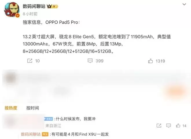 新品发布时间方面,这位博主表示“有可能是4月和Find X9U一起发”。结合来看,以上爆料中提到的两款平板新品都有望在下个月到来。