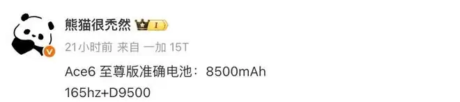 参考博主@熊猫很禿然 的爆料来看,一加 Ace6 至尊版将配备8500mAh的电池,配备165Hz 显示屏,搭载天玑 9500 芯片。