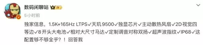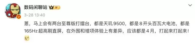 除此之外,同一位博主的爆料还提到过,“马上会有两台至尊版打擂台,都是天玑9500,都是8开头百瓦大电池,都是165Hz超高刷直屏,在外围和增项体验上有差异,应该都是4月”。