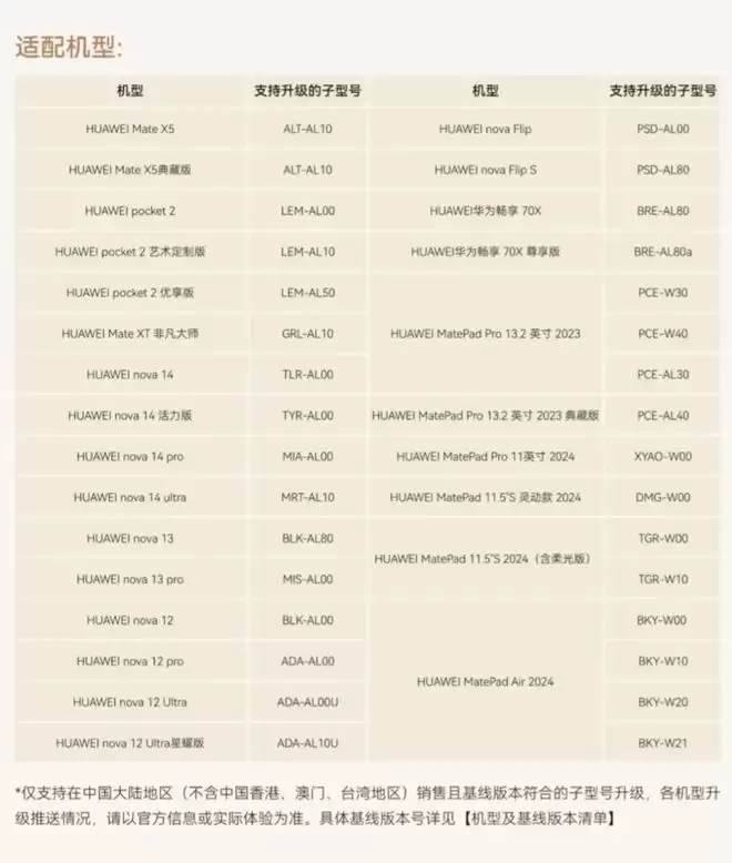 名单里的机型大致可以分为几类:折叠屏家族(Mate X5、Pocket 2、Mate XT非凡大师),nova全系(从nova 12到nova 14,包括活力版、Pro、Ultra)。