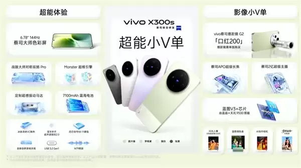 核心配置上,vivo X300s搭载天玑9500处理器,搭配LPDDR5X内存与UFS 4.0闪存,还有蓝图影像芯片V3+,新增iQOO同款Monster超核引擎,游戏体验进一步增强。
