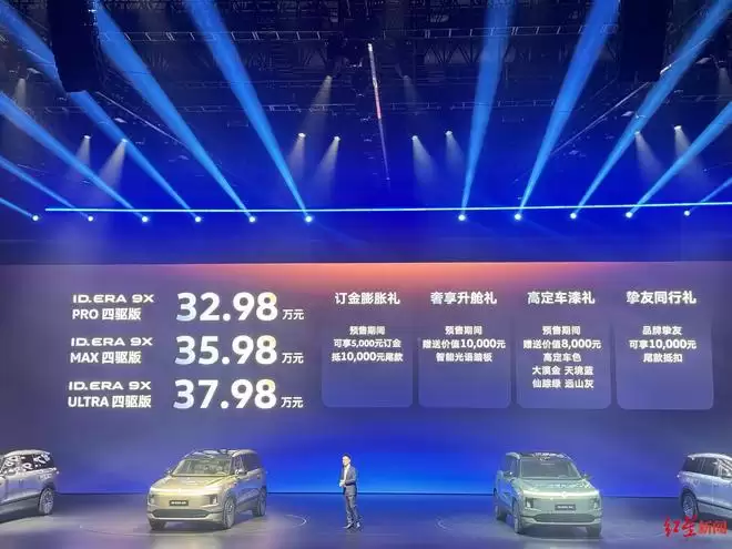 今(30)日,上汽大众旗下全新旗舰SUV——ID. ERA 9X开启预售,本次共推出Pro、Max、Ultra三款四驱版车型,预售价32.98万元起。这款融合了大众最新电动化技术与豪华基因的增程六座车型,其定价策略成为业界焦点,上汽大众此番采取了“越级定价”思路,试图以极具竞争力的价格区间,在高端新能源市场撕开一道口子。