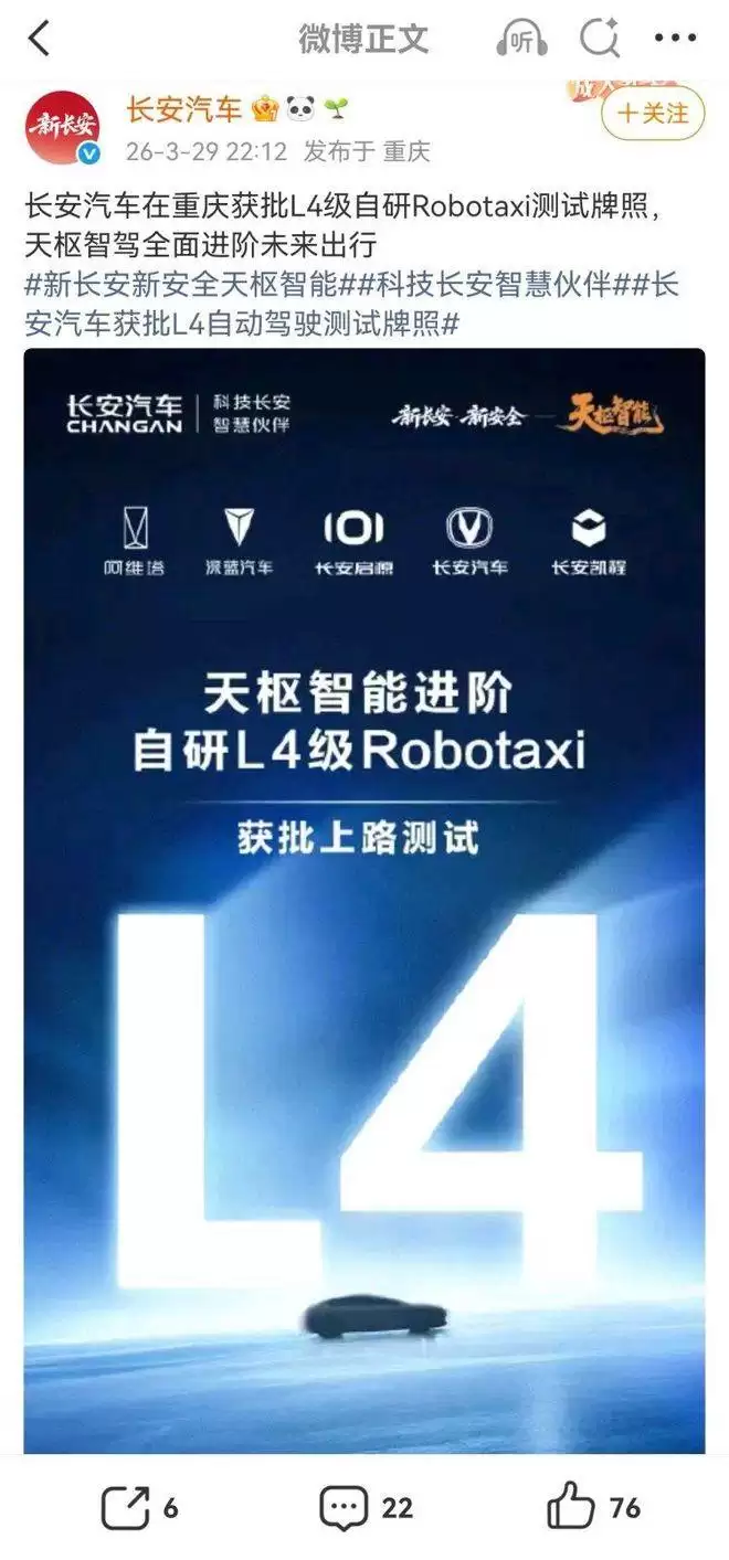 长安L4级Robotaxi获准 重庆智都建设加速自动驾驶