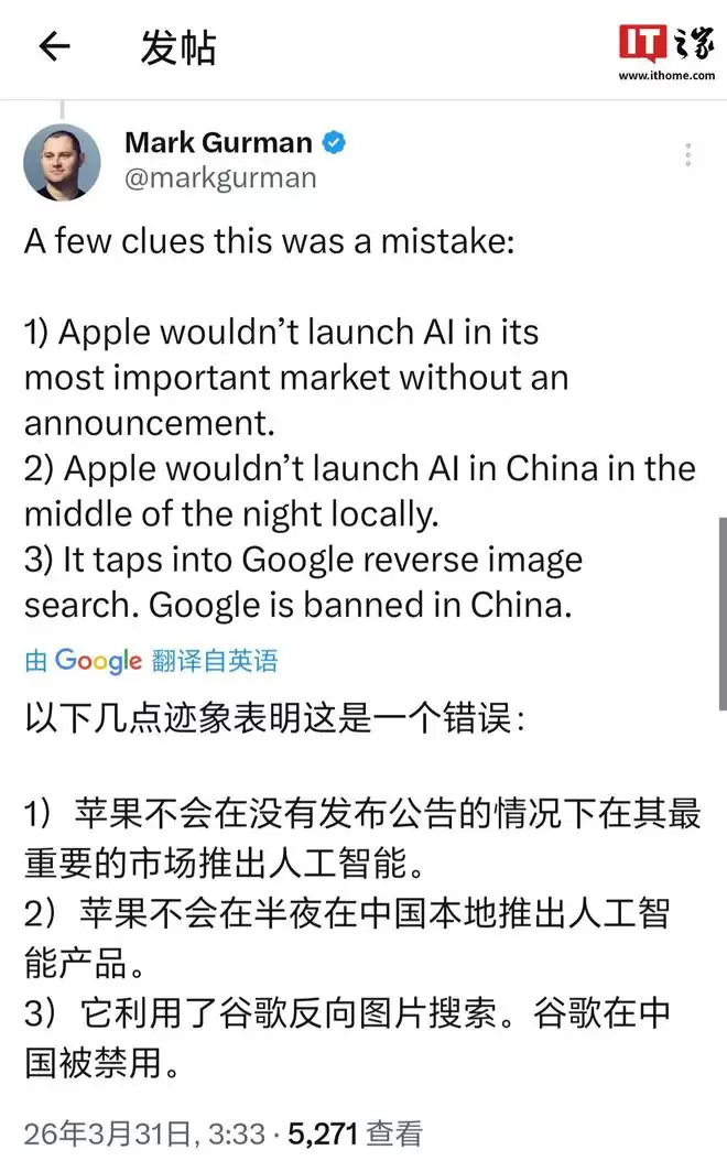 1) 苹果不会在没有发布公告的情况下在其最重要的市场推出人工智能。2) 苹果不会在半夜在中国本地推出人工智能产品。3) 它利用了谷歌反向图片搜索。而谷歌在中国被禁用。