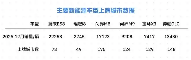 李想对外透露,2026年下半年将推出全新纯电车型i9;蔚来也将推出全新车型ES9,进一步冲击高端市场。此外,传统阵营里宝马新世代iX3、奔驰纯电GLC等新车也将在2026年陆续上市。