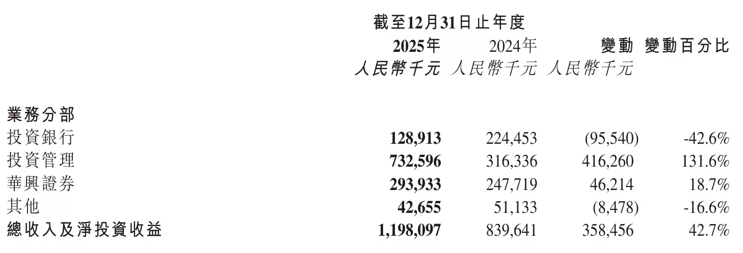 华兴资本2025年来自投资银行收入为1.29亿元,较上年他同期的2.24亿元下降42.6%;投资管理收入为7.33亿元,较上年同期的3.16亿元增长131.6%;华兴证券收入为2.94亿元,较上年同期的2.48亿元增长18.7%。