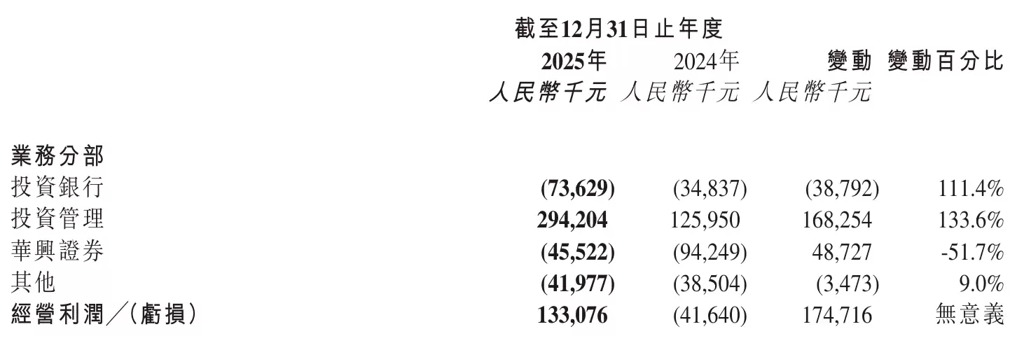 其中,华兴资本2025年来自投资银行运营亏损为7363万元,来自投资管理运营利润为2.94亿元,来自华兴证券运营亏损为4552万元。