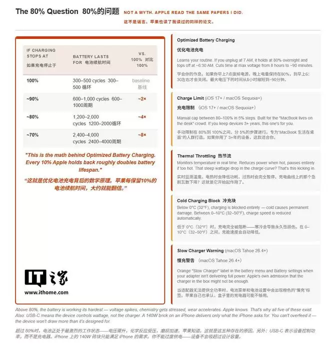 iPhone / iPad 会实时监测电池温度,并限制电流以防止电池过热,峰值充电状态通常仅维持最初的十五分钟。电量超过 50% 后,充电速度会自动放缓。当电量达到 80% 时,系统会切换至涓流充电模式,以此延长电池的整体使用寿命。