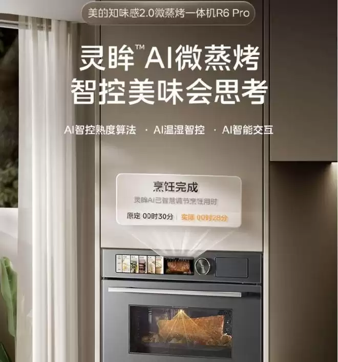 美的的知味感R6 Pro、GR7 系列微蒸烤一体机则主打控制,比如双探头测温,本质是在同时监测腔体温度和食材温度,减少误差;再配合 PID 控温算法,可以根据温度变化实时调整加热功率,避免温度波动过大。而它的风道设计和排湿系统,解决了蒸汽与热风之间的冲突,防止湿度过高影响烘烤效果。