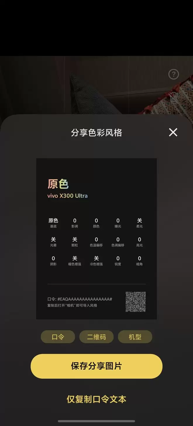 蓝图调色盘负责「玩出彩」,10 种风格预设加上胶片光晕、颗粒、柔光的独立叠加,调好的配方可以二维码或口令分享——这个设计明显在向创作者社区靠拢。