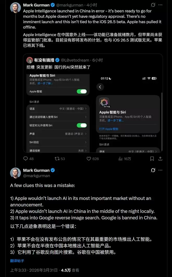 古尔曼提出了三点迹象表明苹果国行AI上线是一个“错误”: