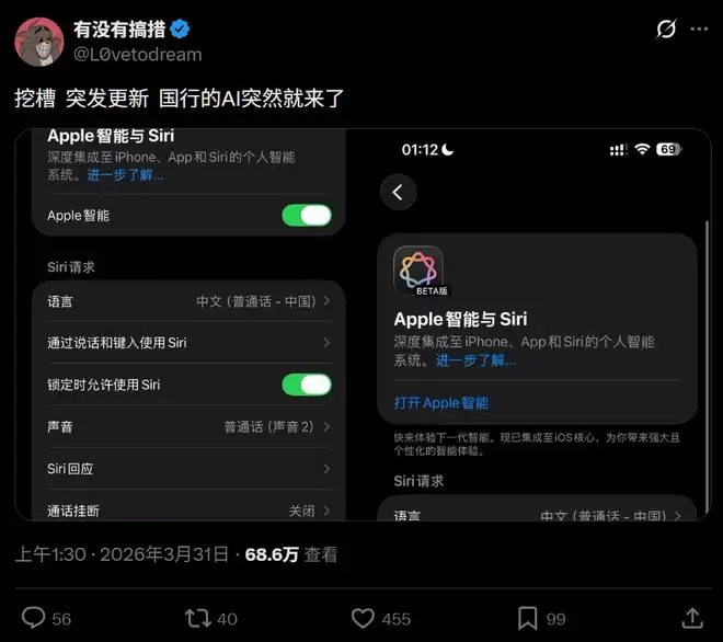 IT之家 3 月 31 日消息,今日凌晨,苹果送上一份惊喜,苹果 Apple Intelligence 国行 Beta 版开始分批上线(需升级至 iOS 26 4 及以上系统)。根据反馈,此次获推升