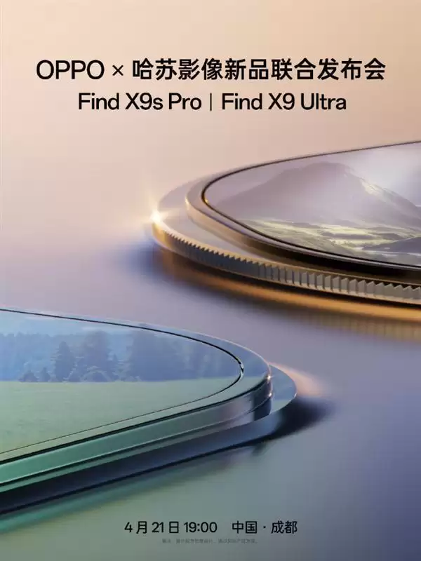 PChome 3月31日消息,OPPO官微官宣,OPPOx哈苏影像新品联合发布会将于4月21日晚19:00在成都举办,Find X9s Pro、Find X9 Ultra等新品将至。据了解,OPPO