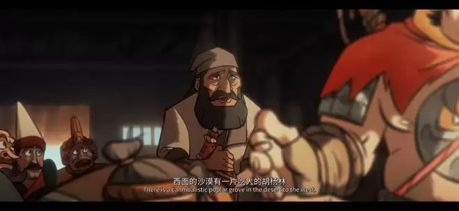 网上还有一些另类的解读,讲的是店主和女儿合伙用羊腿与谎言来欺骗刀客并谋财害命的计划得逞了。从目前的剧情来看也并非绝无此种可能,毕竟只要找到足够的人来配合演戏,用足够猛烈的酒令客人产生幻觉,再通过唯一知情人之口讲出胡杨林的恐怖,在预设一堆前提的情况下,逻辑也能自洽。若以这个角度来解读,那么“胡杨林”是否存在就成了终极的源头,人们还是在踏入一个虚妄的世界,追求不存在的名利。但从整个故事的框架来讲,还是本心战胜执念的说法支撑点更多些。