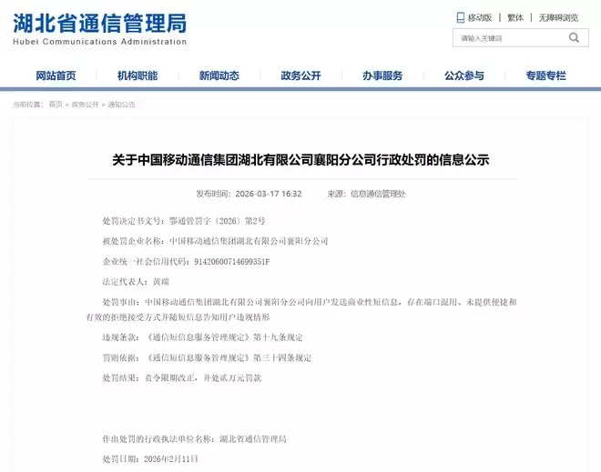 IT之家 3 月 31 日消息,湖北省通信管理局 3 月 17 日发布公告,对中国电信股份有限公司孝感分公司作出行政处罚。