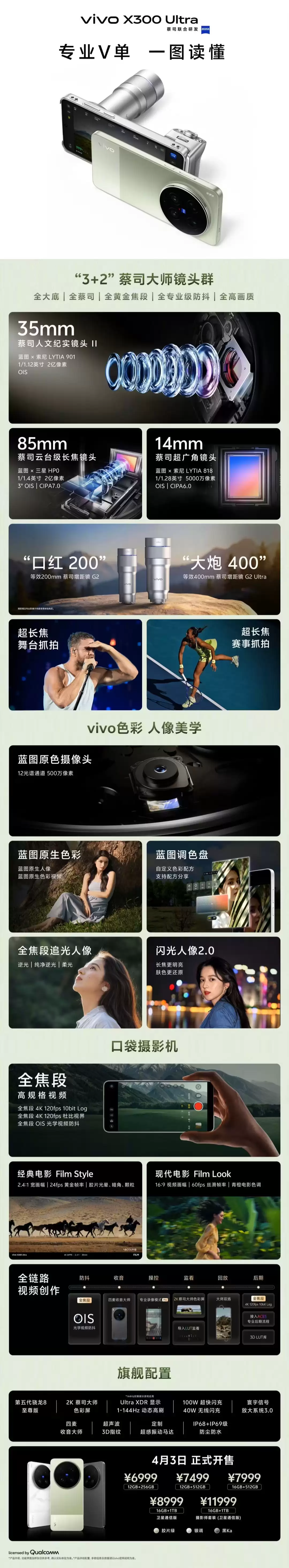 3月31日消息,在 30 日的 vivo X 系列春季新品发布会上,vivo X300 Ultra 手机正式发布。新机号称「专业 V 单」,搭载第五代骁龙 8 至尊版处理器、拥有 3+2 蔡司大师镜头群,售价 6999 元起。