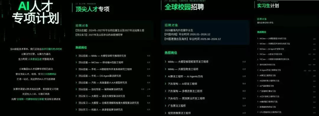 在顶尖人才专项方面,小米将目光投向2024至2027届应届毕业生及2027年出站博士后,同时为2027年及以后毕业的学生开放实习岗位。招聘方向涵盖大模型训练与推理、移动端AI性能优化、端到端自动驾驶算法等核心技术领域,工作地点集中于北京、上海等研发中心。值得注意的是,该计划特别设立"顶尖实习"通道,为高潜力人才提供提前接触前沿项目的机会。