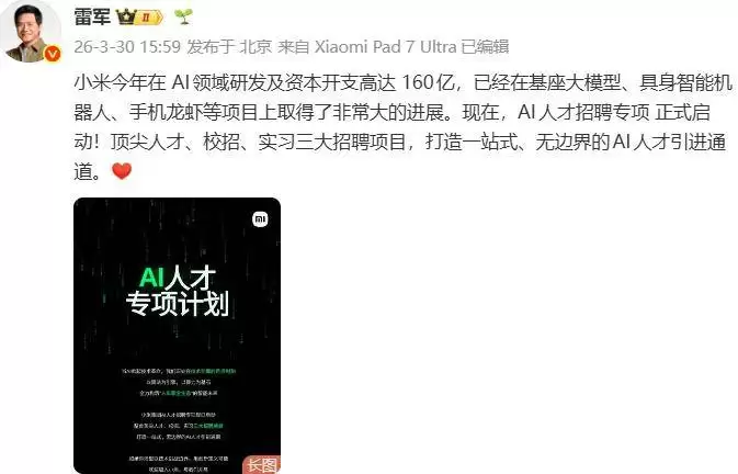 雷军发布AI人才专项计划:三年600亿布局全球招募