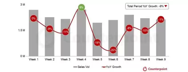 IT之家 3 月 31 日消息,市场调查机构 CounterPoint Research 昨日(3 月 30 日)发布博文,报道称 2026 年前 9 周印度智能手机市场遭遇倒春寒。最新行业调研数据