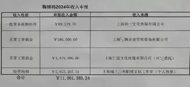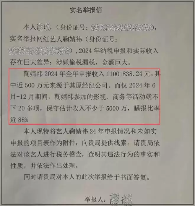 举报材料显示,鞠婧祎2024年全年申报收入约1100万元,其中申报收入近500万元来自丝芭传媒,其余约600万元来自其他渠道。举报人列举了2024年6月至12月的收入情况,指出鞠婧祎参加影视、商务等活动约20项,估算收入不低于5000万,瞒报比例近88%。