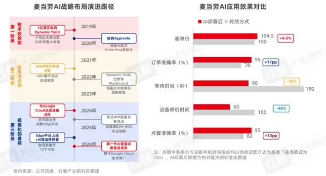 例如,麦当劳是最早部署AI智能点餐的餐饮企业之一。在部署了AI点餐后,其客单价提升4.5%,订单与点餐准确率分别提升17、13个百分点,顾客等待时间、设备停机时间降幅达50%、40%,显著提升了经营效益与运营效率。