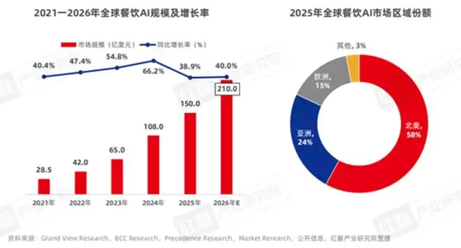 目前,全球餐饮AI市场正处于快速扩张期,规模与增速双高,展现出强劲发展动能。据公开信息,2025年全球餐饮AI市场规模达到150亿美元,同比增长38.9%,预计2026年将突破200亿美元。